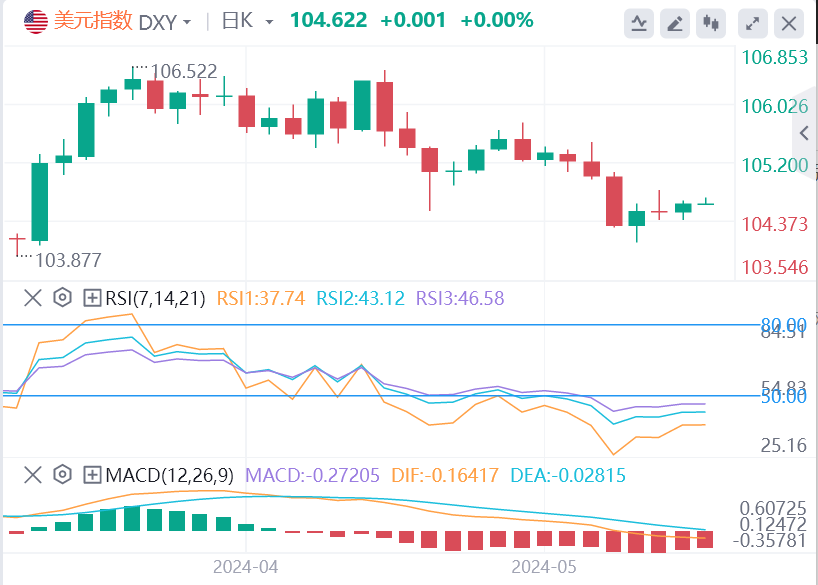周一,美元指数震荡走高,最终收涨0.122%,报104.62。美债收益率保持坚挺,10年期美债收益率最终收报4.45%。对美联储政策利率最敏感的2年期美债收益率最终收报4.852%。截至目前,美元报价104.622