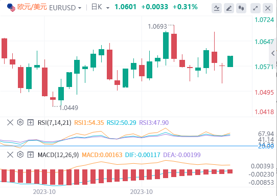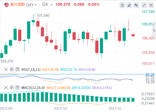 美元指数:截止发稿,美元指数交投于106.37附近。但在美联储决定将利率保持在5.25%-5.50%和杰罗姆·鲍威尔施压后,美元回落至106.60。市场现在将关注周五的交易日,届时美国将公布10月非农就业数据。技术面上,美元指数的牛市枯竭迹象显而易见。RSI在其中线上方显示出平坦的斜率,而MACD直方图显示为红色条。就目前而言,这对指数高于20100和200天SMA,这表明从更大的角度来看,多头处于有利地位,但如果空头设法突破20天的平均线,那么更多的下跌将指日可待。