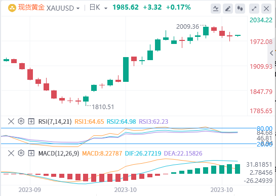 周四亚盘,黄金交投于1985.62附近。美联储 将货币政策维持在 5.5% 不变。美联储(FED)主席鲍威尔表示,长端收益率上升将会持续,并由更高的期限溢价驱动,将影响货币政策,同时美联储主席鲍威尔还称,当前的货币政策已经具有限制性。市场认为加息周期已经结束。这因此又对美元构成一定的抛售压力。芝加哥商品交易所美联储观察工具显示,12 月美联储加息概率约为 22%。