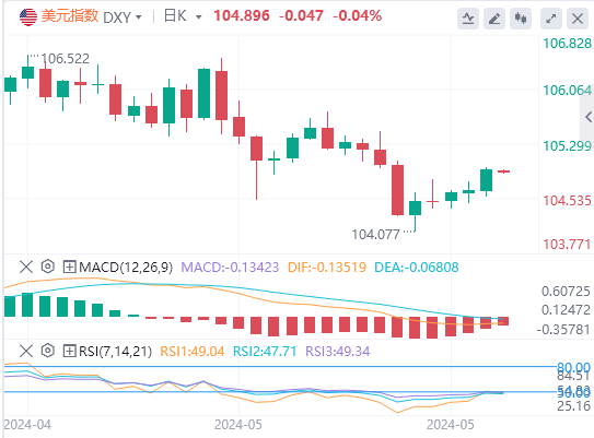 104.896附近。周三,美元指数反弹至周内新高,向上逼近105关口,最终收涨0.279%,报104.94。美债收益率集体反弹,10年期美债收益率冲高回落,但日内仍维持涨势,最终收报4.428%。对美联储政策利率最敏感的2年期美债收益率涨幅更加明显,最终收报4.88%。在日本,由于市场猜测央行调整利率在即,日本10年期国债收益率涨至1%,为2013年5月来首次。随着交易员获利了结,现货黄金大幅回调,接连失守五大关口,最终收跌1.74%,报2378.75美元/盎司,为5月17日以来新低;现货白银四个交易日以来首度走低,最终收跌3.73%,报30.79美元/盎司。由于美联储降息希望减弱可能损害需求前景,以及美国原油库存意外增加凸显市场疲软,国际原油连跌三日。WTI原油最终收跌1.22%,报77.2美元/桶;布伦特原油收跌1.01%,报81.66美元/桶。
