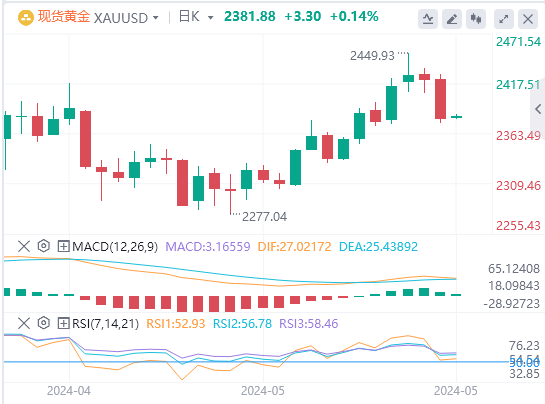 周四亚盘,黄金交投于2381.88附近。随着美国国债收益率上升和美元上涨,黄金价格大幅下跌。美国10年期国债收益率小幅上涨2个基点至4.434%,而追踪美元兑一篮子其他六种货币表现的美元指数上涨,对黄金/美元构成不利因素。联邦公开市场委员会会议纪要显示,美联储官员仍不确定政策限制的程度。他们补充说,“要对通胀可持续地升至2%更有信心,需要比之前预期的更长的时间。