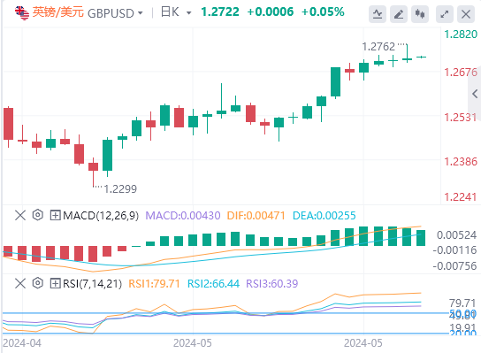 英镑:截止发稿,英镑/美元徘徊于1.2722附近。英镑/美元周三上涨,收报1.2716,涨幅0.06%。英国CPI通胀升温提振英镑(GBP),并为英镑/美元货币对创造顺风。市场将英国央行6月降息的可能性从周二的50%下调至18%。技术面上,英镑/美元收于前一阻力位1.2670-1.2700上方,并正在向下一个阻力位1.2780-1.2800移动。