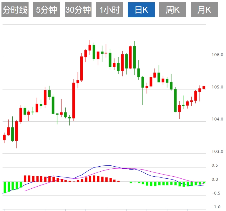 美元:截止发稿,美元指数现报105.09,日内上涨0.06%。美国经济展现出强劲势头,美联储的谨慎态度使美元保持稳定。下周公布的美国4月个人消费支出(PCE)数据将决定短期走势。此外,交易员对美联储降息的广泛希望在2024年之前已经慢慢化为泡影。去年12月,市场普遍预计美联储将在年底前至少降息六次。快进到5月下旬,投资者正争先恐后地抱有单次降息的希望,可能最晚在12月。技术上,日线图上的指标反映了看涨和看跌观点之间的某种僵局。尽管空头努力站稳脚跟,但该指数仍高于 100 天和 200 天简单移动平均线 (SMA),这有力地证明了买入势头的存在和弹性。然而,相对强弱指数 (RSI) 在负值区域徘徊表明,看跌的紧缩可能即将到来。