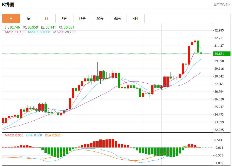 现货白银:截止北京时间20:22,现货白银下跌,现报30.650,跌幅0.41%。纽市盘前,白银价格在对价格形成良好支撑的EMA50附近波动,等待测试代表我们下一个主要目标的30.06美元,提醒您打破它将推动价格遭受额外的损失,达到29.30美元。