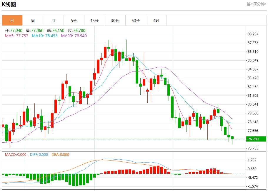原油市场:截止北京时间20:22,美油下跌,现报76.770,跌幅0.12%。纽市盘前,原油价格在77.00美元附近徘徊,等待新的负面动机推动价格恢复今天的预期看跌浪潮,目标是75.24美元作为下一站,注意EMA50继续支持预期的下跌,除非突破77.64美元并保持在其上方,否则将保持有效。