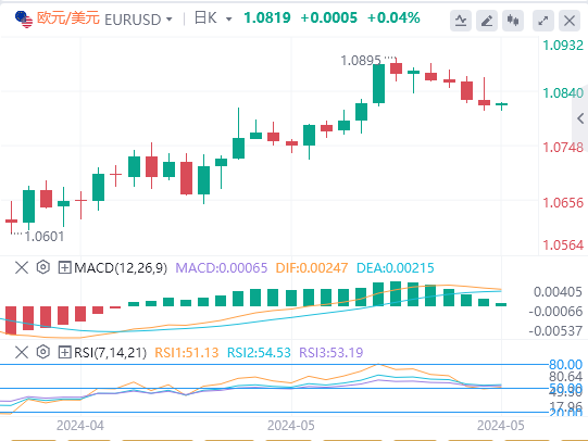 欧元/美元周四小幅下挫,但仍维持在1.0800以上。周五欧洲早盘,该货币对在1.0820附近窄幅波动。德国联邦统计局在当天早些时候证实,第一季度实际国内生产总值环比增长0.2%。