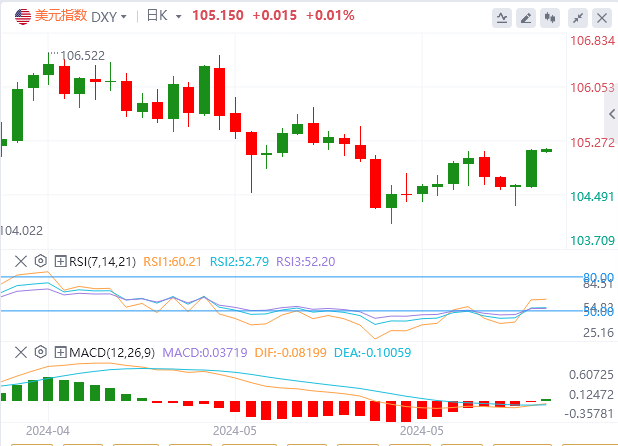 美元指数:截止发稿,美元指数交投于105.15附近。由于美联储(Fed)官员不断要求耐心等待,导致对即将到来的9月联邦公开市场委员会(FOMC)会议降息的押注减少。作为反应,美国国债收益率回升。由于美国经济依然强劲,6月和7月降息的可能性仍然很低,市场热切期待有助于押注9月会议的数据。技术面上,如果美元指数收于105.00上方,它将走向最近的阻力位,即105.75-106.00区间。