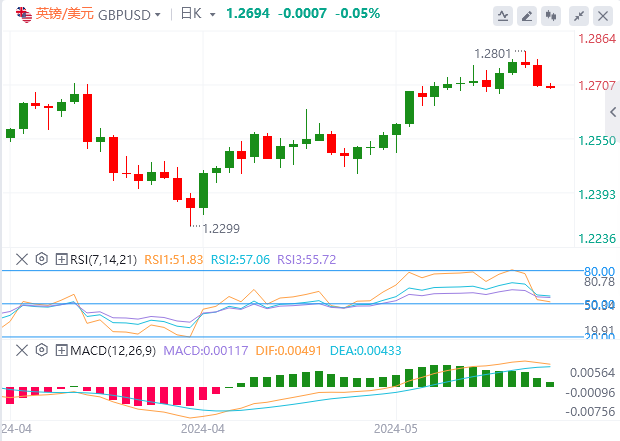 英镑:截止发稿,英镑/美元徘徊于1.2694附近。英镑/美元周三下跌,收报1.2710,跌幅0.48%。英国央行(BOE)将于6月份启动降息的预期拖累英镑(GBP)走低。国际货币基金组织(IMF)上调了英国经济增长预期,但预计英国央行将降息两到三次。在英国无重要经济数据公布的情况下,大选前景可能会推动英镑走势。市场若维持担忧英国政治前景可能会打压英镑,并对英镑/美元构成阻力。技术面上,如果英镑/美元跌破支撑位1.2670-1.2700,它将走向下一个支撑位1.2580-1.2600。