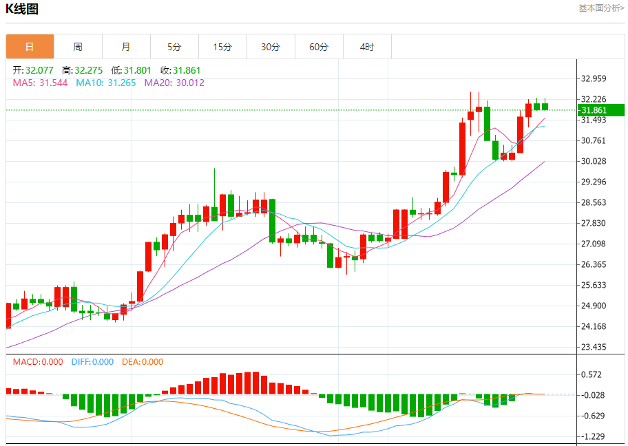 现货白银:截止北京时间20:22,现货白银下跌,现报31.86,跌幅0.69%。纽市盘前,白银价格从早上开始就在一个横盘轨道内波动,稳定在32.00美元左右,因此,今天的看涨趋势没有改变。