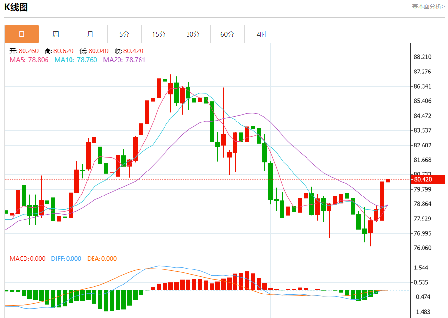 原油市场:截止北京时间20:22,美油上涨,现报80.420,涨幅0.75%。纽市盘前,原油价格恢复积极交易,接近81.00美元的关口,增强了对今天剩余时间继续看涨趋势的预期。