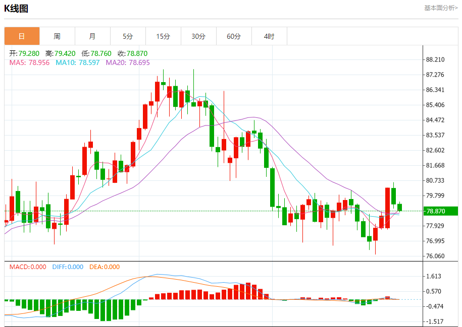 原油市场:截止北京时间20:22,美油下跌,现报78.87,跌幅0.44%。纽市盘前,原油价格在79.60美元左右波动,直到现在仍低于该水平,以保持今天的熊市趋势情景有效,价格需要突破79.00美元才能确认反弹至77.64美元作为下一个主要目标。