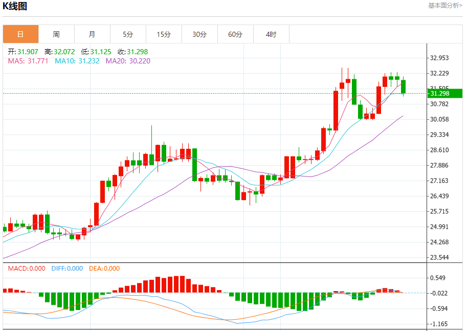 现货白银:截止北京时间20:22,现货白银下跌,现报31.30,跌幅1.98%。纽市盘前,在今天早上接近31.00美元后,白银价格现在提供了积极的交易,只要价格低于31.85美元,修正看跌趋势将在今天保持活跃,其目标是从突破31.00美元开始,以确认向30.06美元前进,考虑到持续上涨和突破31.85美元将推动价格实现更多收益,并初步测试32.50美元。