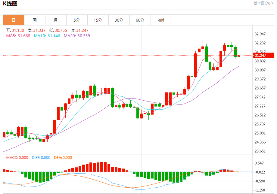 现货白银:截止北京时间20:22,现货白银上涨,现报31.24,涨幅0.35%。纽市盘前,白银价格在31.00美元找到了坚实的支撑,显示出受随机利好影响的看涨倾向,只要价格低于31.75美元,我们今天的看跌观点将继续有效,等待负面动机的出现,以确认突破上述支撑并为下一个主要目标30.06美元打开反弹之路。