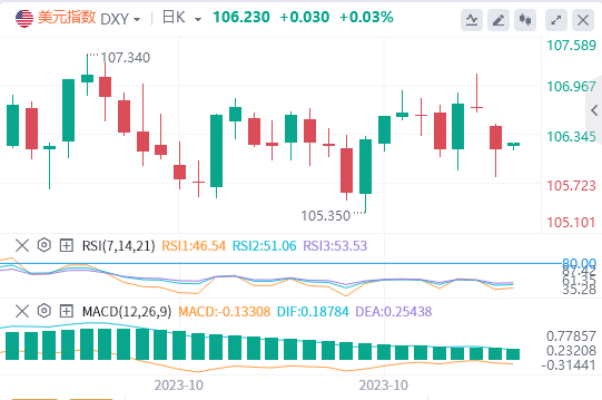 美元指数:截止发稿,美元指数交投于106.23附近。美元周四暴跌,美元指数跌至106.15,原因是对美联储的鸽派押注,以及周三的决定和主席鲍威尔的语气后美国债券收益率下降。所有人的目光都集中在周五10月的非农业工资报告上,该报告可能会在短期内为美元定下基调,并扩大其损失。技术面上,日线图的技术分析表明,随着空头努力进行复苏并发挥其影响力,美元指数的立场从中性到看跌。RSI指向中线以下的南方,而MACD直方图显示红色条带增加。此外,该指数低于20天SMA,这可能为短期内的进一步下跌铺平道路。