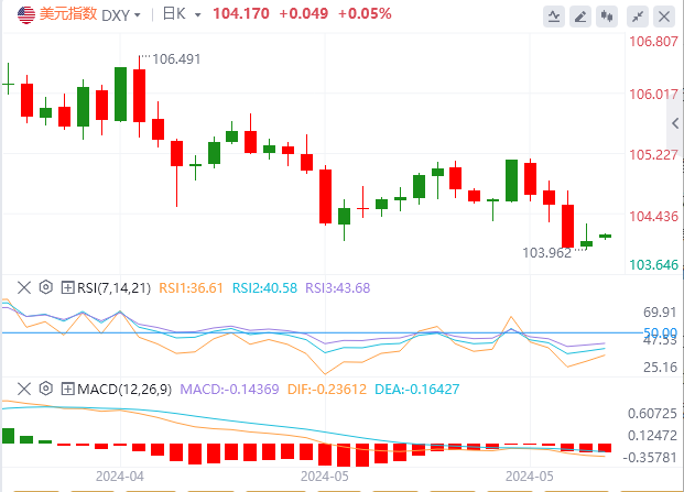 周二,美元指数在亚盘欧盘时段呈上行趋势,但因公布的美国4月JOLTs职位空缺数据显示出经济走软迹象而回吐部分涨幅,截至目前,美元报价104.17。