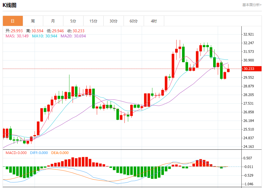 现货白银:截止北京时间20:20,现货白银上涨,现报30.224,涨幅0.83%。纽市盘前,白银价格受到随机利空的影响,显示出轻微的看跌倾向,此外,EMA50对价格形成阻力,等待获得积极的动机,帮助推动价格恢复今天的预期看涨趋势,其下一个目标位于31.00美元。