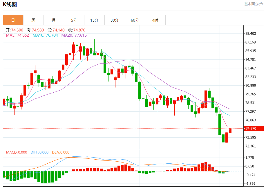原油市场:截止北京时间20:20,美油上涨,现报74.88,涨幅1.09%。纽市盘前,原油价格提供了额外的积极交易以达到75.25美元的等待目标阈值,等待获得额外的积极势头以帮助推动价格实现更多上涨。