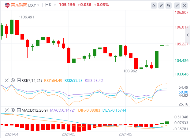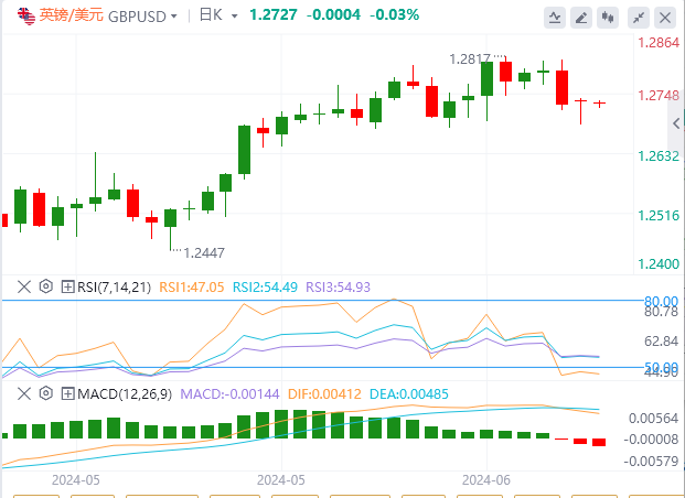 英镑:截止发稿,英镑/美元徘徊于1.2727附近。英镑/美元周一上涨,收报1.2731,涨幅0.05%。过去几个月,英国就业增长一直在萎缩,五月份可能会继续萎缩,这使得英国央行(BOE)更容易开始降低借贷成本。不过,衡量工资增长的平均收入仍然很高,这可能会说服英央行推迟今年的宽松周期。任何就业市场数据走强的迹象都可能在短期内支撑英镑。技术面上,如果这次尝试成功,英镑/美元将向50均线1.2737移动。突破50均线将推动英镑/美元跌向阻力位1.2780–1.2800。