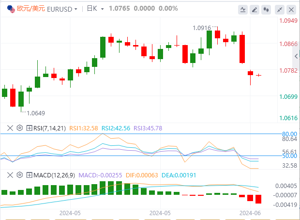 欧元:截止发稿,欧元/美元徘徊于1.0764附近。欧元/美元周一下跌,收报1.0765,跌幅0.35%。进入新的交易周后,欧盟议会选举令欧元步履蹒跚,因为议会洗牌形势跌宕对决策构成了短期风险,严重拖累了欧元。除了周三早些时候的德国消费者物价调和指数(HICP)终值外,欧盟方面经济事件清淡,这使得欧元在更广泛的市场调整前面临即将到来的美联储(Fed)利率决议以及美联储利率预测点阵图摘要更新并将受到影响。技术面上,欧元/美元正试图从数周低点反弹。如果欧元/美元回落至1.0750上方,它将走向阻力位1.0785-1.0800。