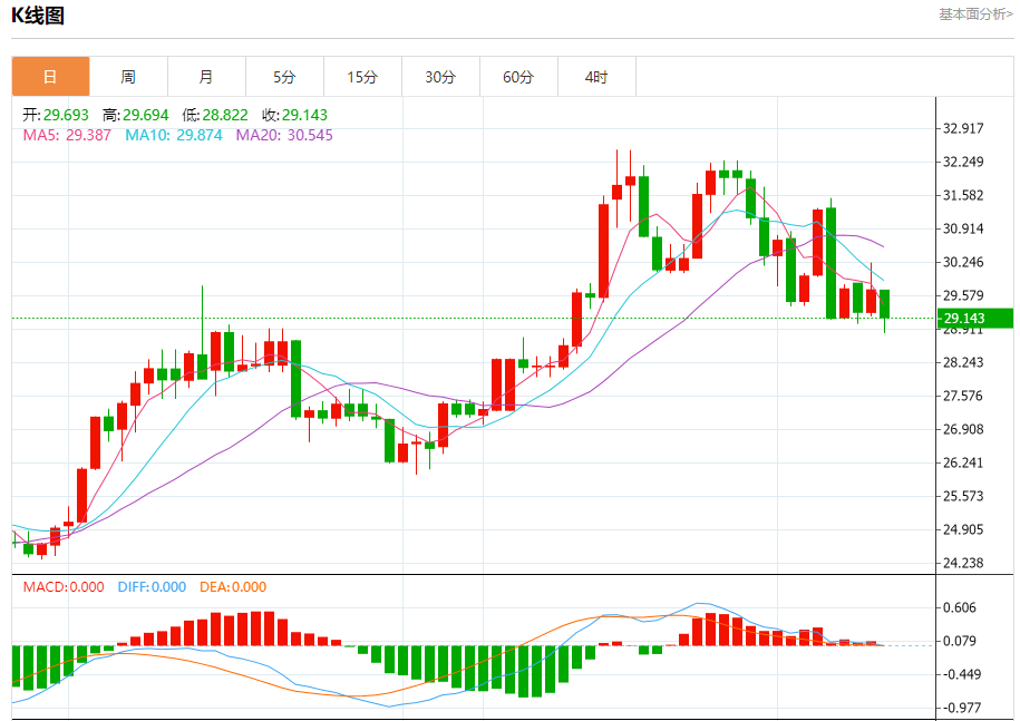 现货白银:截止北京时间20:21,现货白银下跌,现报29.129,跌幅1.91%。纽市盘前,银价现在正在测试关键阻力29.30美元,价格需要保持在该水平以下,这是继续预期看跌趋势的首要条件,目标是28.55美元作为下一个主站。