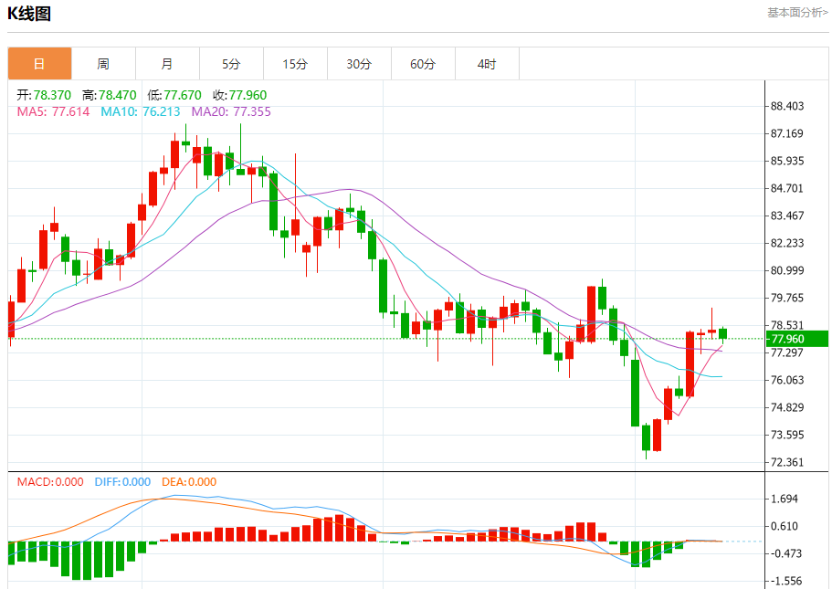 原油市场:截止北京时间20:21,美油下跌,现报77.960,跌幅0.68%。纽市盘前,原油价格持续下跌至关键支撑位77.64美元,正如我们今天上午提到的那样,价格需要保持在这一水平以上才能保持今天的看涨趋势,因为突破这一水平将使价格受到负面压力,目标是76.70美元,然后是75.25美元的水平作为下一个主要站。