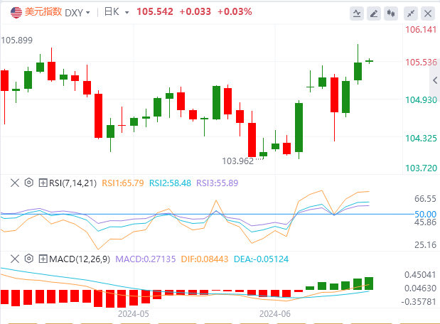 上周五,因欧元大幅疲软,并创下两月来最大单周跌幅,美元指数回升,并创近一个月来新高,截至目前,美元报价105.54。