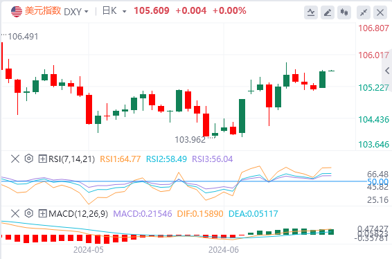 6月21日,北京时间周五亚市早盘,美元指数徘徊在105.60附近。周四,美元指数大幅上涨,最终收涨0.42%,报105.59。10年期美债收益率先涨后跌,最终收报4.264%。对美联储政策利率最敏感的2年期美债收益率最终收报4.750%。由于一系列普遍疲软的经济数据或加大了美联储在晚些时候降息的可能性。现货黄金日内涨超1%,并一度站上2360美元关口,创近两周新高,最终收涨1.36%,报2359.97美元/盎司。现货白银日内大涨3%,并重回30大关上方,最终收涨3.26%,报30.71美元/盎司。两油延续涨势,并逼近逾一个月高点。WTI原油站上81美元,最终收涨0.7%,报81.10美元/桶;布伦特原油收涨0.27%,报84.85美元/桶。
