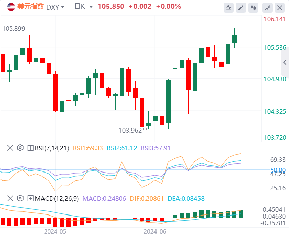 6月24日,北京时间周一亚市早盘,美元指数徘徊在105.85附近。上周五(6月21日),在利好的美国PMI数据刺激下,美元指数最高涨0.3%并一度升破105.90,再创5月1日以来的七周新高,全周累涨0.2%,连涨三周。日元则创下自3月以来最长连跌纪录,截至上周五连跌七日,逼近160水平。美债收益率在美国PMI数据发布前跌至日低,随后反弹转涨,对货币政策更敏感的两年期美债收益率日内最高上行2个基点并上逼4.75%,全周涨超2个基点。10年期基债收益率最高涨3个基点至4.28%,全周涨近4个基点。因强于预期的PMI数据可能促使“美联储发出更强硬的信号”,交易员考虑美联储后续动向,现货黄金盘中失守2320美元/盎司,日内跌幅一度接近2%,较日高回落近50美元,最终收跌1.62%,报2321.87美元/盎司。现货白银跌破30美元关口,收跌3.88%,报29.55美元/盎司。现货钯金盘中暴涨逾10%,随后骤然回吐大多数涨幅。分析指出,日内宽幅震荡或与交易商的空头回补行为有关。原油进入超买区后下跌,WTI原油收跌0.83%,报80.96美元/桶;布伦特原油收跌0.66%,报84.32美元/桶,但在美国库存减少和燃料需求上升的迹象下,国际油价仍成功录得两周连涨,全周涨超3%。
