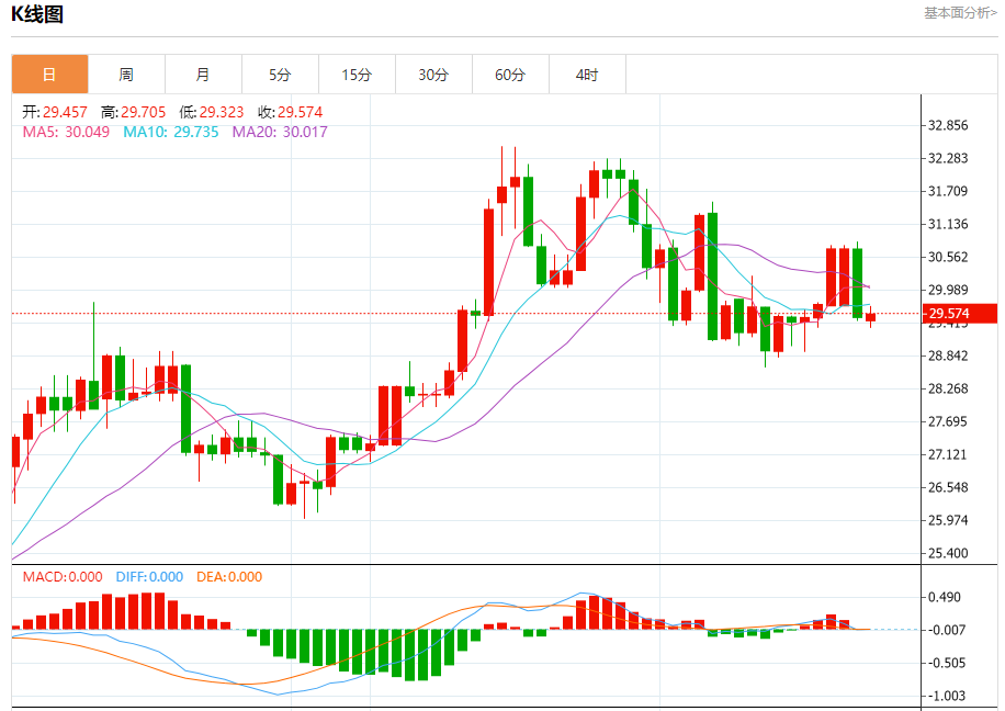 现货白银:截止北京时间20:21,现货白银上涨,现报29.576,涨幅0.21%。纽市盘前,白银价格显示自上午以来一直在横盘交易,只要价格低于30.06美元,我们的看跌观点就将保持有效,因为今天没有任何变化,注意到我们正在等待突破29.30美元,以确认将熊市波向28.55美元延伸作为下一个目标,而随机积极性解释了当前横盘波动的原因。