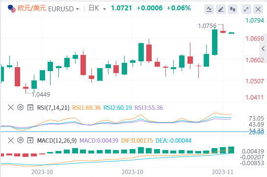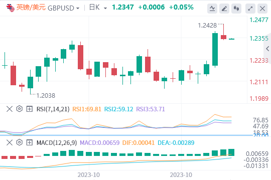 欧元:截止发稿,欧元/美元徘徊于1.0721附近。上周五欧元/美元下跌,收报1.0718,跌幅0.15%。欧元区数据显示,德国服务业PMI终值为48.2,欧元区整体PMI终值为47.8。此外,11月欧元区投资者信心指数(投资者信心指数)改善至-18.6。技术面上,欧元/美元继续走强,并正在朝着200日移动平均线和1.0800的方向继续前进。目前,中期趋势方向已发生变化,对200日移动平均线的测试可能只是暂时的,如果欧元/美元遭遇假突破并且下跌,但交易者需要留意在1.0650点附近可能出现的支撑,因为这可能引发市场的看涨反应。