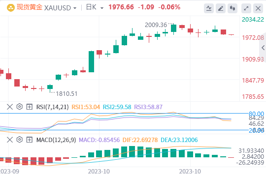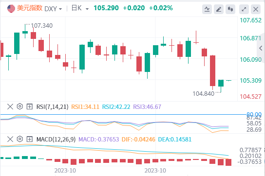 美元指数:截止发稿,美元指数交投于105.29附近。受市场情绪不佳和美国债券收益率上升的影响。在本周剩下的时间里,投资者将关注鲍威尔主席周三的讲话,以获得12月美联储下一次会议的进一步线索。技术面上,根据日线图,美元指数保持中性至看跌的技术观点,表明尽管势头增强,但多头尚未完全控制。RSI在中线以下显示出下降趋势,而MACD直方图显示出更大的红条。使前景中性的是,该指数保持在20天SMA以下,但高于100天和200天SMA,这表明多头在更广泛的前景中仍然占据上风。