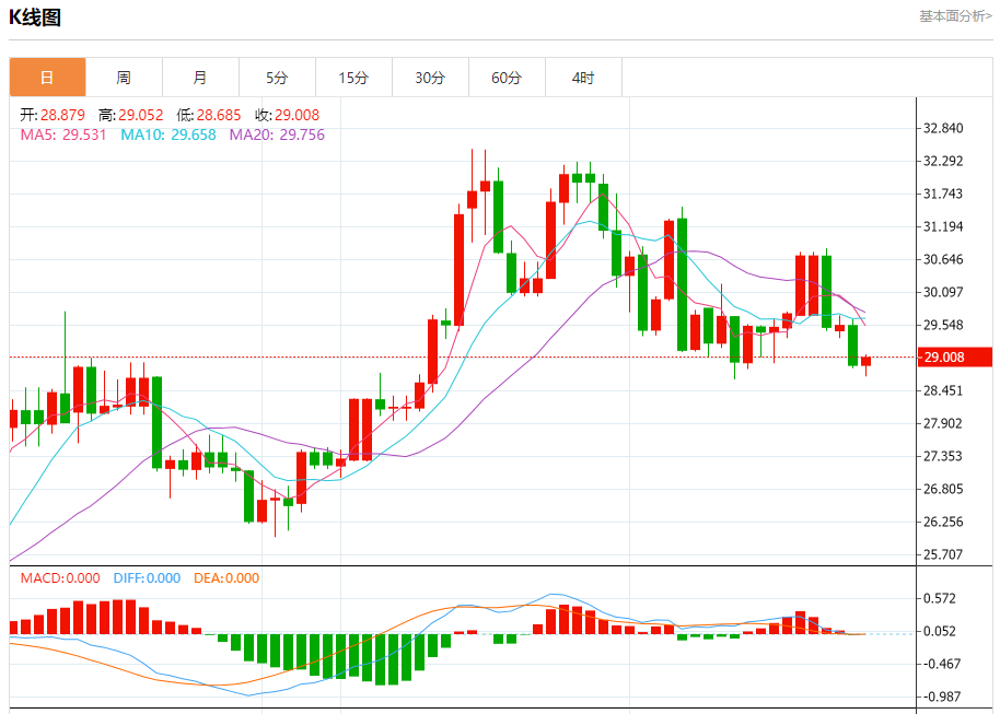 现货白银:截止北京时间20:26,现货白银上涨,现报29.003,涨幅0.43%。纽市盘前,受随机利好影响,白银价格显示出一些轻微的看涨偏差,但只要价格低于29.30美元,我们的看跌观点将在今天保持有效,受到EMA50形成的负压的支持,提醒您我们的目标从28.55美元开始,并在突破前一水平后延伸至27.62美元。