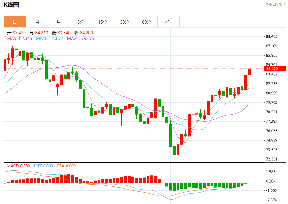 原油市场:截止北京时间20:26,美油上涨,现报84.220,涨幅1.01%。纽市盘前,原油价格首次突破83.90美元,并试图保持在83.90美元上方,加强了在未来几个交易日继续看涨趋势的预期,为我们走向下一个主要目标85.80美元开辟了道路。