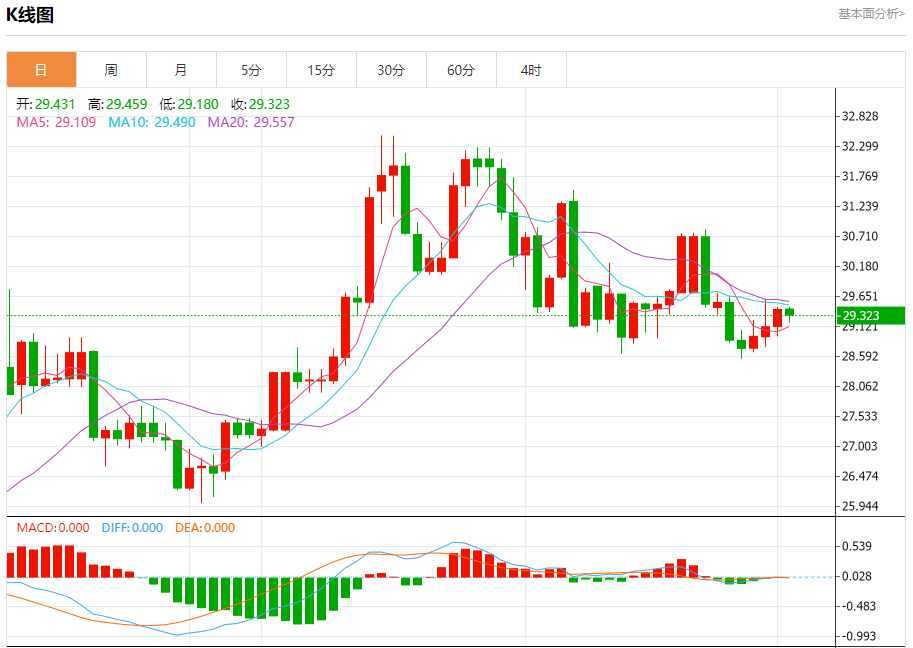 现货白银:截止北京时间20:26,现货白银下跌,现报29.324,跌幅0.33%。纽市盘前,白银价格正在测试关键支撑29.30美元,并对其施加负面压力,这促使人们在即将到来的交易中保持谨慎,因为价格受到随机负面因素的影响,可能会导致更多的下跌并回到熊市轨道。