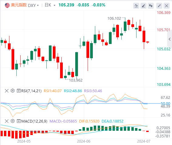 美元指数:截止发稿,美元指数交投于105.23附近。美元指数回落,因交易员对弱于预期的ISM服务业PMI报告做出反应。报告显示,ISM服务业采购经理人指数从5月份的53.8下降到6月份的48.8。今天,交易员还有机会查看5月份的工厂订单数据。工厂订单环比下降0.5%,而分析师普遍预期为+0.2%。ISM服务业采购经理人指数(PMI)报告发布后,美国国债收益率走低,给美元带来额外压力。从技术上讲,如果美元指数成功收于105.00以下,它将走向下一个支撑位,即104.40-104.60区间。