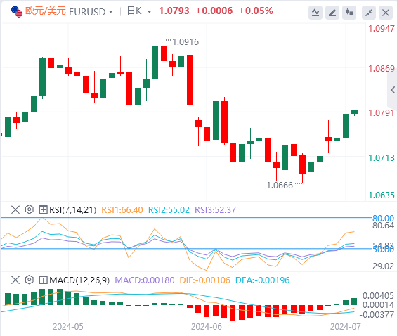 欧元:截止发稿,欧元/美元徘徊于1.0793附近。欧元/美元周三上涨,收报1.787,涨幅0.39%。欧元/美元随着交易员关注好于预期的欧元区服务业采购经理人指数报告,价格上涨。报告显示,欧元区服务业采购经理人指数从5月份的53.2降至6月份的52.8,而分析师普遍预期为53.5。高于50的数字表示扩张。技术面上,成功测试1.0785-1.0800的阻力位将为测试下一个阻力位1.0900-1.0915开辟道路。