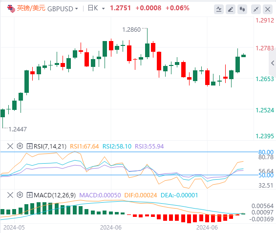英镑:截止发稿,英镑/美元徘徊于1.2751附近。英镑/美元周三上涨,收报1.2742,涨幅0.45%。英镑/美元由于英国服务业采购经理人指数(PMI)报告超出分析师预期,该指数上涨。疲软的ISM服务业采购经理人指数(PMI)报告为英镑/美元提供了额外的支撑。技术面上,交易者应注意,RSI处于超买区域,因此回调的风险正在增加。