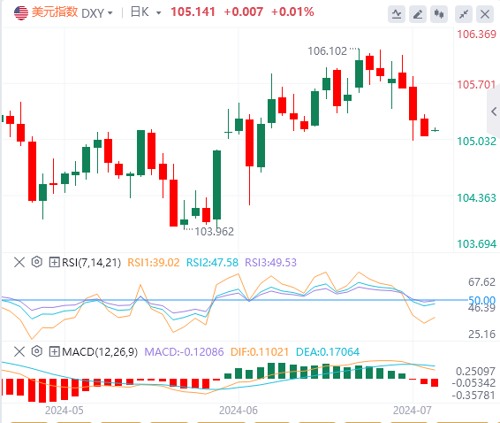 7月5日,北京时间周五亚市早盘,美元指数徘徊在105.14附近。周四,美元指数继续跌向105关口,最终收跌0.179%,报105.06,创6月中旬以来新低。由于美国独立日假期交投清淡,现货黄金在非农到来之际持稳,盘中多次挑战2360美元关口,最终收涨0.06%,报2357.45美元/盎司。现货白银最终收跌0.35%,报30.39美元/盎司。随着交易员们继续消化美国原油库存下降的数据以及中东地缘政治局势,国际油价连续第二个交易日收涨。WTI原油收涨0.57%,报84.04美元/桶;布伦特原油盘中触及4月底以来的最高点,最终收涨0.56%,报87.52美元/桶。