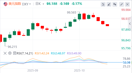 10月17日,北京时间周五亚市早盘,美元指数徘徊在98.18附近。周四,美元指数延续跌势,最终收跌0.31%,报98.361。美债收益率普跌,基准的10年期美债收益率跌破4%,最终收报3.973%,对美联储政策利率敏感的2年期美债收益率收报3.431%。随着美国信贷市场爆雷推动避险情绪升温,以及美联储降息预期增强,现货黄金连续第四个交易日创下历史新高,单日暴涨115美元至每盎司4300美元以上,最终收涨2.8%,收报4326.12美元/盎司;现货白银站上54美元关口,最终收涨2.19%,报54.15美元/盎司。石油供应过剩加剧以及对全球经济前景的担忧,令国际原油再创五个多月新低。WTI原油美盘跟随风险资产跳水,最终收跌2.39%,报56.87美元/桶;布伦特原油最终收跌2.23%,报60.84美元/桶。