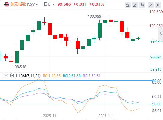 11月28日,北京时间周五亚市早盘,美元指数徘徊在99.58附近。周四,美元指数整体上先涨后跌,触及日内高点后抹去全部涨幅,最终收跌0.059%,报99.53。由于感恩节假期市场交投清淡,现货黄金横盘震荡,最终收跌0.14%,报4157.99美元/盎司,仍徘徊在近两周高点附近;现货白银连涨四日,最终收涨0.1%,报53.4美元/盎司。在交易员观望俄乌谈判走向以及展望本周末举行的欧佩克+会议之际,国际原油连续第二个交易日走高。WTI原油站上59关口,最终收涨0.96%,报59.03美元/桶;布伦特原油最终收涨0.77%,报62.89美元/桶。